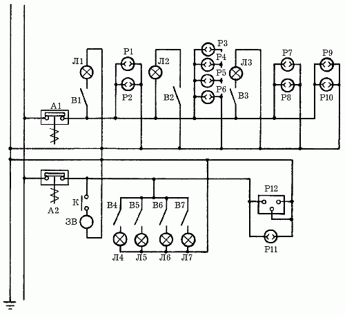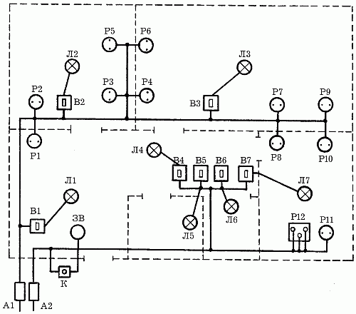 Рис. 34. Пример домашней электрической проводки. Принципиальная схема: А1, А2 – автоматические предохранители; Л1– Л7 – лампы светильников; В1-В7 – выключатели светильников; Р1-Р11 – розетки; Р12 – разъем для подключения электроплиты; ЗВ – электрический звонок; К – кнопка электрического звонка