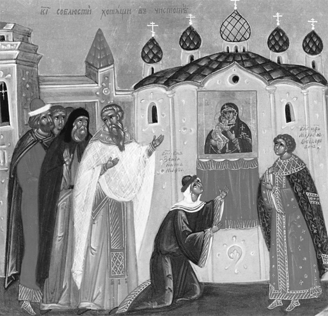 Благословение на царство Михаила Фёдоровича иконой Фёдоровской Божией Матери его матерью инокиней Марфой в Ипатьевском монастыре
