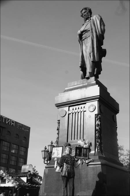 У памятника поэту во время шествия «Бессмертного полка». Слева – портрет Григория Григорьевича Пушкина, правнука поэта. Фотография. Москва. 9 мая 2016 г.