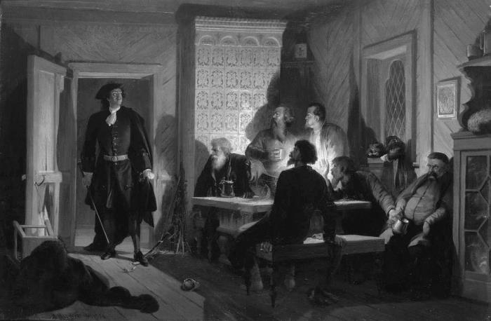 Петр I накрывает заговорщиков в доме Цыклера 23 февраля 1697 года. Художник А.И. Шарлемань (среди заговорщиков и предок поэта Фёдор Пушкин)