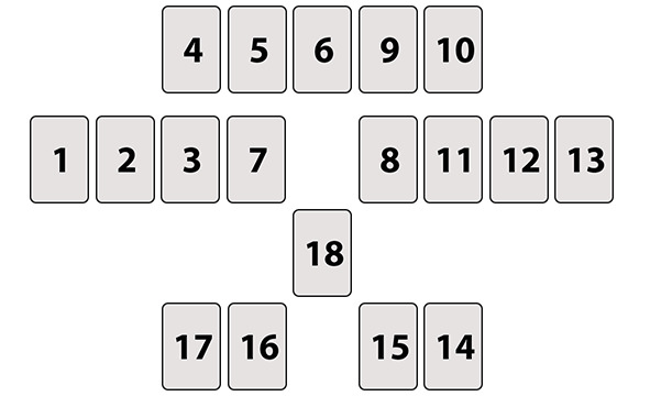 Этот расклад выполняется с помощью карт Младших Арканов и дает общую оценку ситуации. Но это не мешает Вопрошающему получить большой объем информации. Из колоды, предварительно перетасованной, достаются семнадцать карт, к ним добавляется Сигнификатор, выбранный наугад, и все это выкладывается по схеме. Расположение Сигнификатора здесь не определенно, поэтому он может выпасть в любом месте расклада, привлекая, таким образом, внимание Вопрошающего к той или иной области его жизни. Например, Сигнификатор вышел под номером восемнадцать. Смотрим по схеме: 18 – это исход гадания.