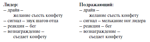 Два брата играют в ожидании возвращения домой отца. Обычно отец приходит с конфетой для каждого. Старший, играя, слышит звук шагов у входа. Для него это служит сигналом возвращения отца. Реагируя на сигнал, он бежит к входу. Для младшего ребенка звуки шагов отца еще не служат отличительным сигналом и поэтому не «воодушевляют» его бежать. И часто он продолжал играть, когда старший убегал навстречу отцу. Но в данном случае младший брат побежал за старшим и каждый получил от отца по конфете. В следующих подобных случаях младший будет чаще бежать, просто увидев бегущего брата. Продолжая получать подкрепление конфетой, поведение младшего стабилизируется: он будет бежать, глядя на брата, во всех случаях, даже если место и время будут варьировать. Таким образом, он научается подражать старшему брату, но шаги отца еще не приобрели для него характера сигнала. Схематично Миллер и Доллард представляют это следующим образом: