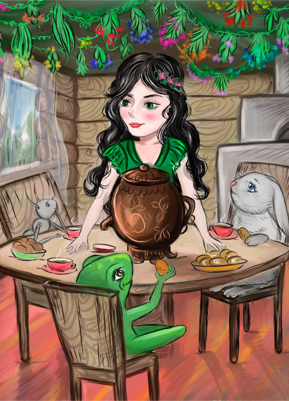 В центре избушки стоял стол, на котором сверкал медный самовар. В левом углу за пучками сушеных трав, висевшими на веревках, пряталась печка. На лавке, свернувшись клубком, спал белый кот. Одним глазком взглянув на вошедших, он тут же потерял к ним интерес.