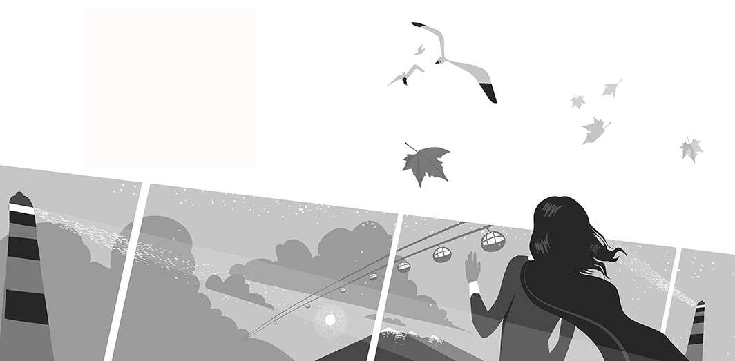 Эта очередь к Экрану. Люди едут по канатной дороге через залив вверх, на гору, там пункт приёма воспоминаний. Конверт нужен, чтобы сесть в кабинку и чтобы потом в здание войти. В конверте – инструкция по сдаче воспоминаний, она очень простая, и там картинок много. Это как со спасательным жилетом в самолете. Всё и так понятно. А если чего непонятно, то можно спросить любого дежурного в ярко-голубой куртке – например, ту рыжую женщину…