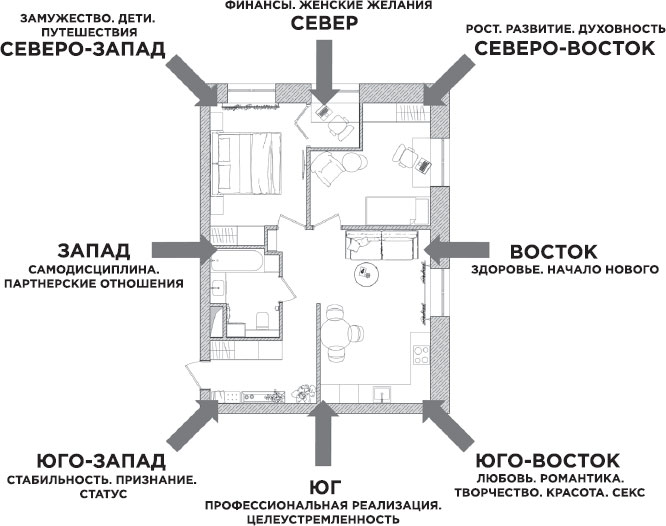 Если в каком-то из этих секторов у вас есть недостатки (а что такое недостатки в каждой зоне, мы разберем в следующих главах), то страдать будет именно та сфера жизни, за которую отвечает данный сектор.