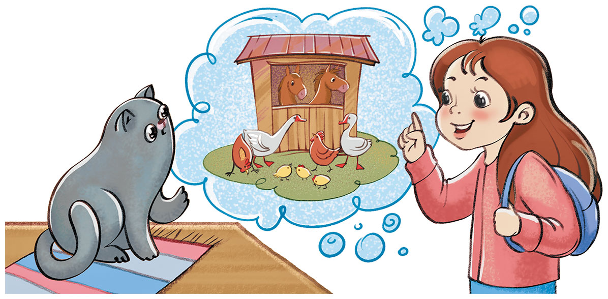 – Я тебе про неё ещё не рассказывала! Мои родители давно мечтали о семейном деле, которое будет связано с животными. И наконец эти мечты сбылись! Теперь у нас есть конюшня и небольшая ферма при ней. Там лошади, овечки, куры, гуси и даже маленькая свинка есть! И всем этим животным нужна забота, поэтому я еду туда в свой выходной день…