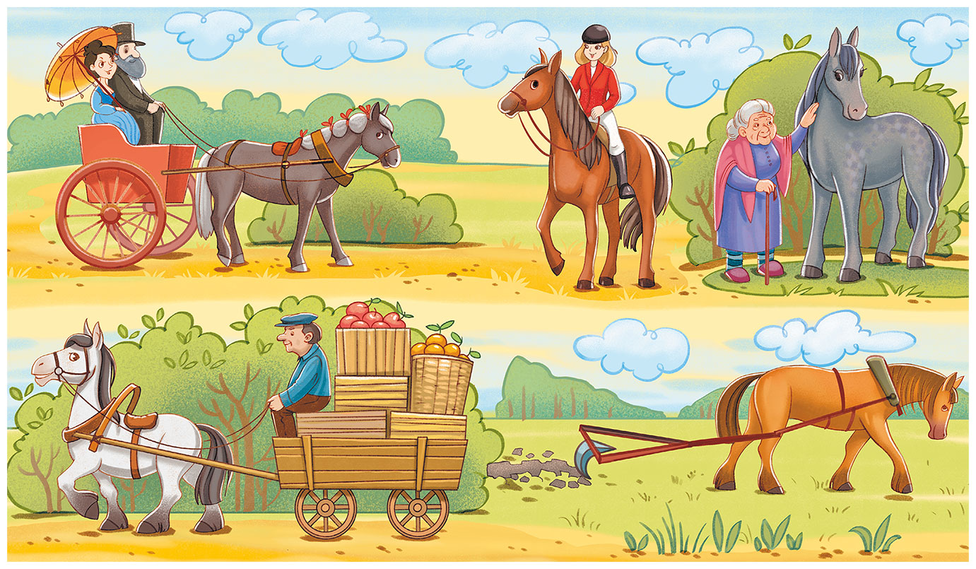 – …Лошадь – надежный помощник людей, – продолжала экскурсию Дуня. – Раньше лошади помогали людям вспахивать землю, перевозить тяжёлые грузы. Такие рабочие лошадки трудились изо дня в день. И путешествовали раньше люди только на лошадях. Это потом уже появились поезда и самолёты. А до этого внуки ездили к бабушкам в гости на лошадях. Видишь, какое полезное животное!
