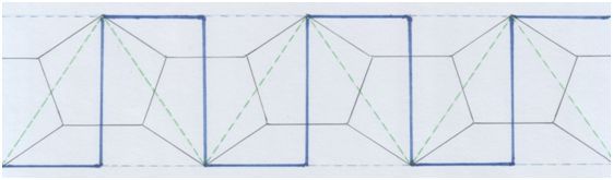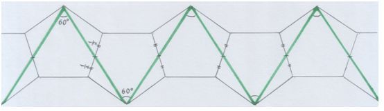 Левые узлы (лента вяжется в узел зеркально: справа налево) – квинты, идущие вниз – бемольные тональности. Пятиугольники вершинами вниз означают явление понижения, «бемольность». (На модели – синие вершины.)