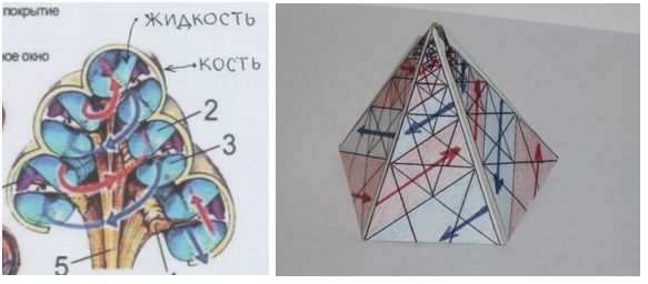 Если собрать пентаграмму в пирамиду, она легко смоделирует двойную спираль (красные и синие полосы в модели). Такую же спираль образуют электрические сигналы внутри нашей ушной улитки (красные и синие стрелки). Эти сигналы и поступают в наш мозг, а мозг представляет их нам в виде звуков. Так мы слышим мир и слышим его музыку.