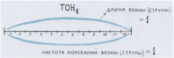 Если зажимом пережать струну посередине (разделить её надвое) и ударить молоточком (или ущипнуть) ½ струны, уши услышат новый тон – в 2 раза выше (напряжённей) первого, струна будет колебаться в 2 раза чаще. То есть ч а с т о т а к о л е б а н и й ½ струны равна 2 (двум). А полученный тон созвучен первому до невероятно согласного звучания: как будто тот же, только в два раза выше.