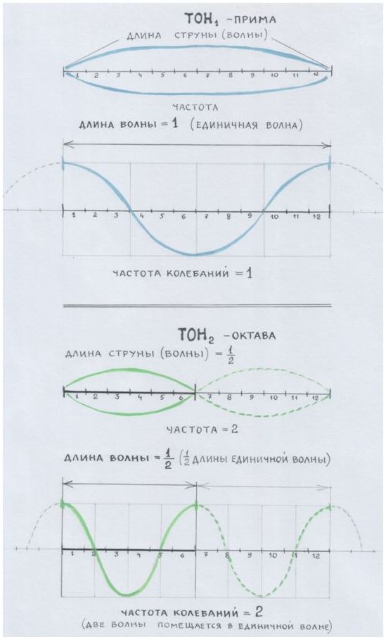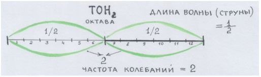 А длина струны (или волны) и частота её колебаний взаимно зависимы. Зависимы в обратной пропорции: длина – ½, частота – 2.