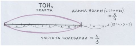 Струну Пифагор поделил на четыре части и установил зажим между тремя и четвёртой частью: длина струны – ¾. Частота колебаний – 4/3.