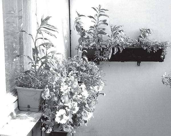 Слева на фото (б) находятся два ящика – один сверху, стоит на подоконнике. Второй ниже. По цвету они светлее, чем предыдущий, поскольку смотрят прямо на солнце. В верхний ящик можно посадить цветы повыше, в нижний – низкие или средней высоты (чтобы не заслоняли цветы из верхнего ящика).