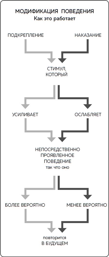 Это различие между отрицательным и положительным может вызвать некоторое недопонимание, поэтому вернемся к Питеру и Уоллаби. Питер использовал модель положительного подкрепления, чтобы изменить поведение Уоллаби, убедительно говоря ему: «Мне нравится, что ты прыгаешь; сделай это еще несколько раз». Поощрение подкрепляло положительное поведение Уоллаби. Питер наказывал Уоллаби с помощью метода отрицательного наказания: никакой похвалы или лакомства, если Уоллаби прыгал, когда Питер не просил его об этом, что означало: «Ты можешь прыгать весь день, но я тебя игнорирую. Делать так не имеет никакого смысла».