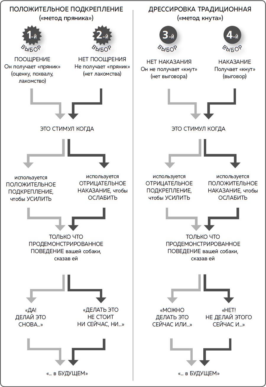 Дрессировка собак с помощью методики положительного подкрепления ориентирована на получение поощрения. Вот почему мы используем одновременно и положительное подкрепление (когда поощряем) и отрицательное наказание (когда лишаем поощрения). Традиционные методы дрессировки ориентированы на наказание. Те, кто им следуют, стремятся выделить положительное наказание (производя физическую коррекцию в форме резкого окрика или рывка поводка со строгим ошейником) и отрицательное подкрепление (лишение наказания, например, не дергать поводок со строгим ошейником).