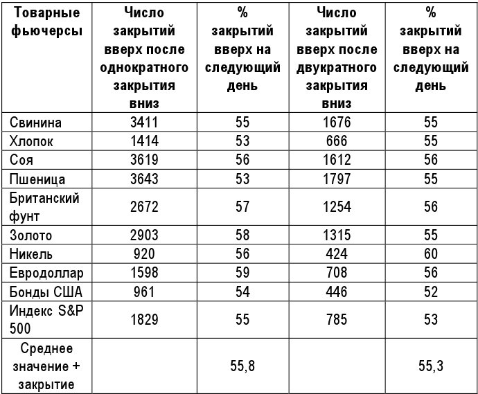 Таблица 1.2 Товарные фьючерсы. Количество закрытий с превышением после однократного и двукратного закрытия вниз