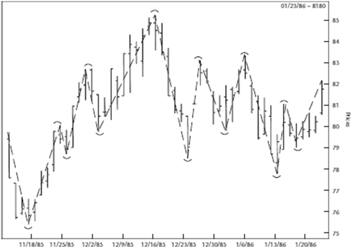 Держа в уме вышесказанное, я перешел от типового графика к реальным графикам фьючерсов на швейцарский франк и кофе (см. Рисунки 1.8 и 1.9). В первую очередь я отметил все краткосрочные колебания, а затем начал наносить, согласно графической модели, максимальные/минимальные краткосрочные точки. Затем я идентифицировал следующую группу максимальных/минимальных среднесрочных точек и, наконец, перешел к долгосрочным точкам. На словах все звучит замечательно, но пока вы не изучите эти графики, вам будет трудно представить правильную картину. Поупражняйтесь.
