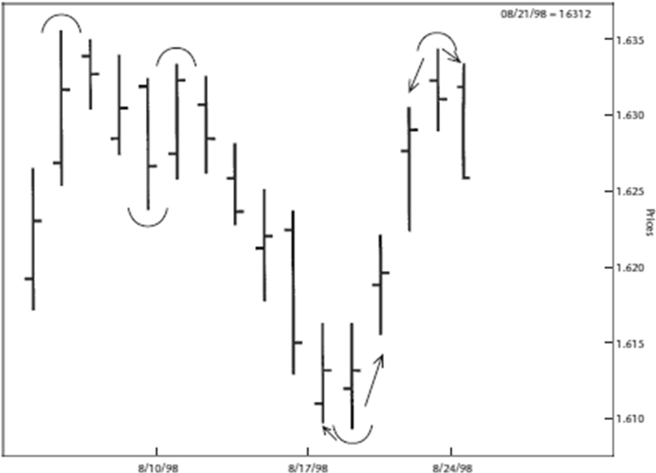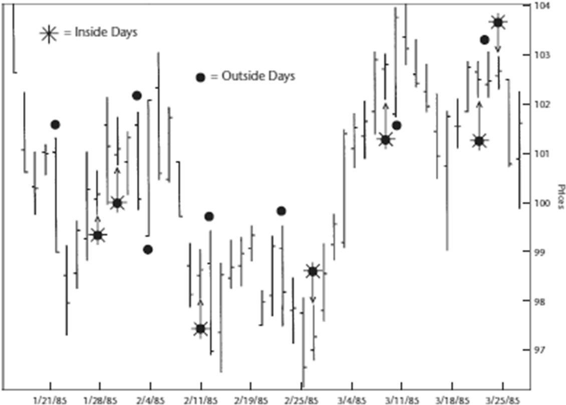 Держа в уме вышесказанное, проанализируйте Рисунок 1.5, служащий иллюстрацией внутренних и внешних дней. Не забывайте, что мы стремимся идентифицировать краткосрочные колебания, при которых трейдеры перемещают цену от одной точки остановки к другой.