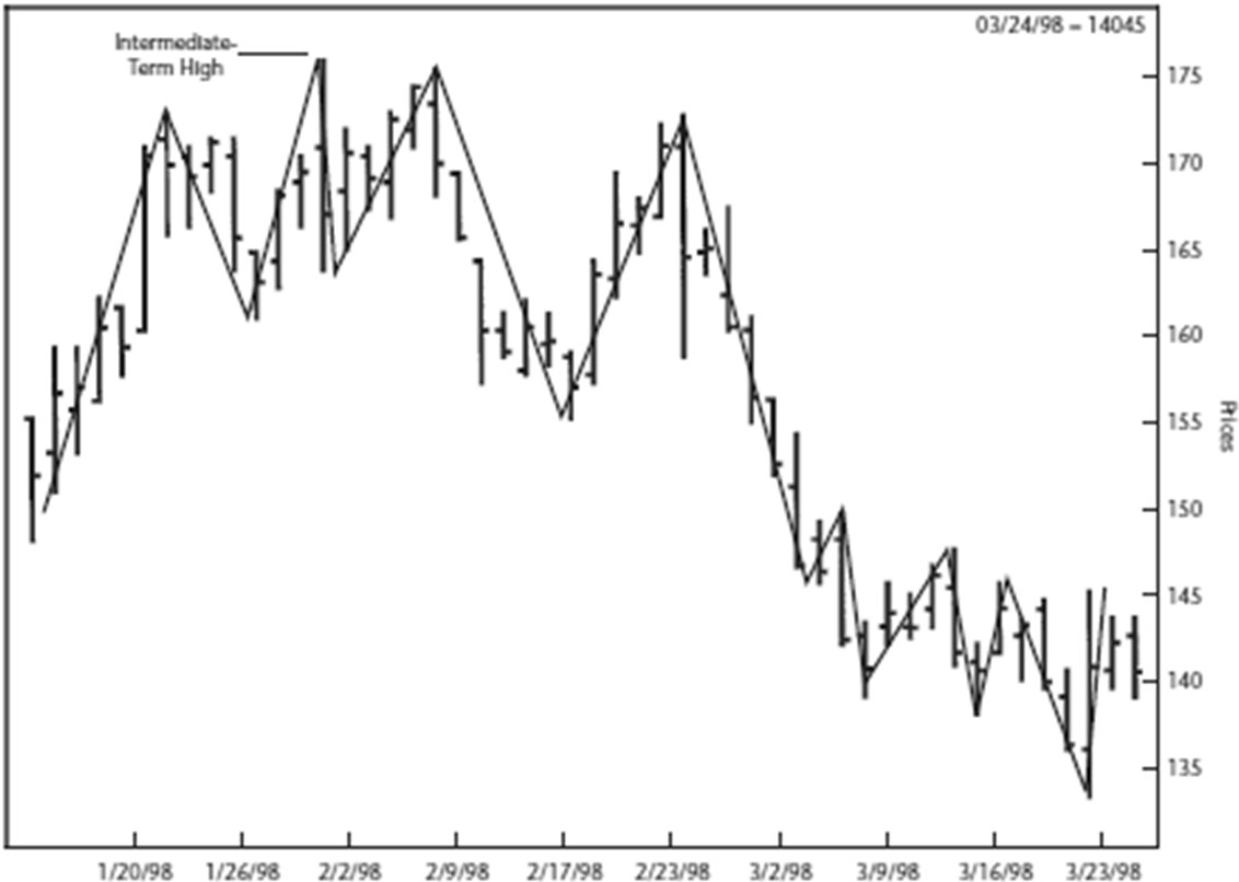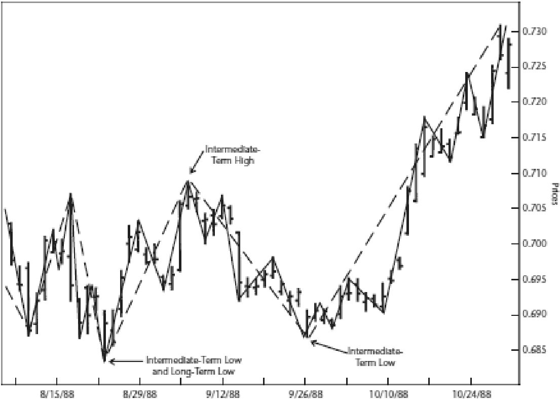 Определение среднесрочных максимумов и минимумовА теперь самое интересное! Смотрите: если мы можем выделить краткосрочный максимум, определив его как день с более низкими максимумами (не учитывая внутренние дни) с обеих сторон, мы можем сделать гигантский шаг вперед и определить среднесрочный максимум (intermediate term high) как какой-либо краткосрочный максимум с более низкими краткосрочными максимумами по обеим сторонам. Но это еще не все, потому что мы можем сделать еще один шаг и сказать, что любой среднесрочный максимум с более низкими среднесрочными максимумами с обеих сторон – вижу, вы уже схватили суть – образует долгосрочный максимум (long-term high).