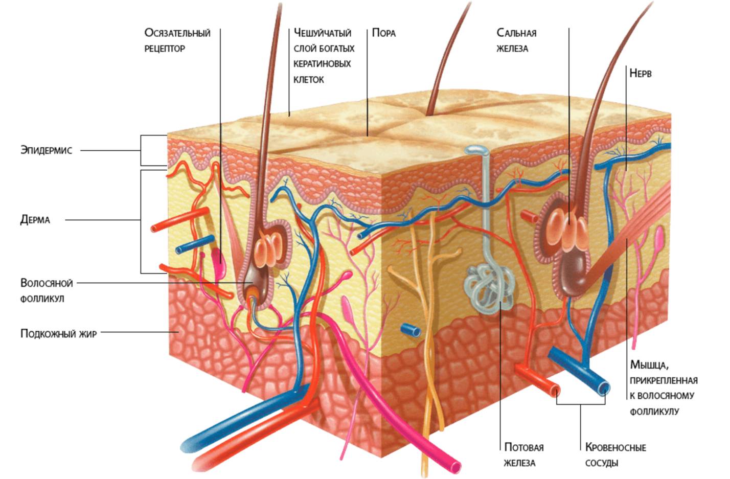 Кожа состоит из эпидермиса, дермы, гиподермы и придатков кожи. Эпидермис представляет собой многослойный ороговевший эпителий, он состоит из 5 слоев клеток: базального (зародышевого), шиповидного, зернистого, блестящего, рогового. Полная смена эпидермиса происходит в течении 45-65 дней.