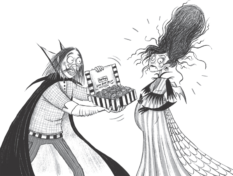 ‘HERE, my disastrous little wart-picker!’ said Count Drake, trying to catch his breath. He opened the box to reveal a freshly made batch of Foot Fudge. ‘I dashed to your favourite bakery, Drop Bread Gorgeous. And look, there are extra-crusty bits from in between the toes, just how you like it!’
