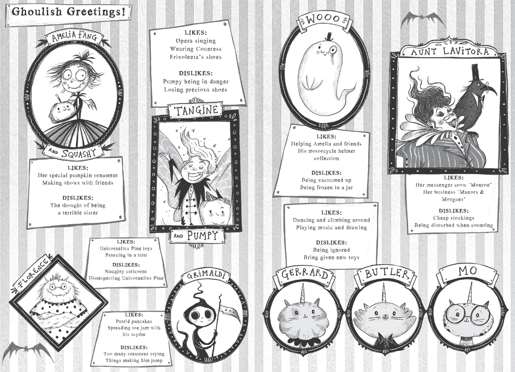 ‘Hi, Gerrard. Hi, Butler. Hi, Mo!’ she said to each caticorn in turn. ‘I’m Amelia! And this is my pet pumpkin Squashy, and my best friends, Florence and Grimaldi.’
