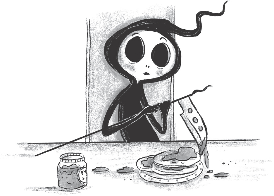 ‘NICE,’ said Florence with a grimace. ‘AN’ YOU JUST USED THE SAME SCYTHE FOR SPREADING JAM THAT YOU USE TO SWEEP UP SQUISHED TOADS!’