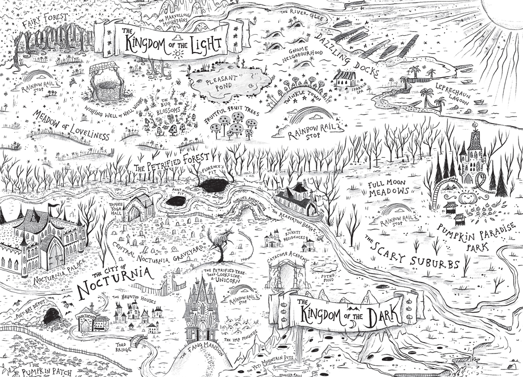 ‘Now class, you may remember I asked you all to put together a presentation on a subject of your choosing, to introduce our visitors to the Kingdom of the Dark,’ Miss Inspine continued. ‘Tangine, I believe you’re up first – what is the title of your presentation?’
