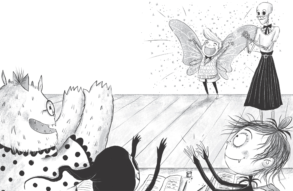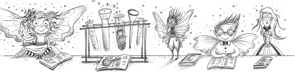 Five fairies of varying sizes waved shyly from the back of the classroom, not looking remotely alarmed that their new headmistress was a skeleton. One teeny weeny fairy with a puffy dress had fallen asleep inside a test tube and was snoring loudly.