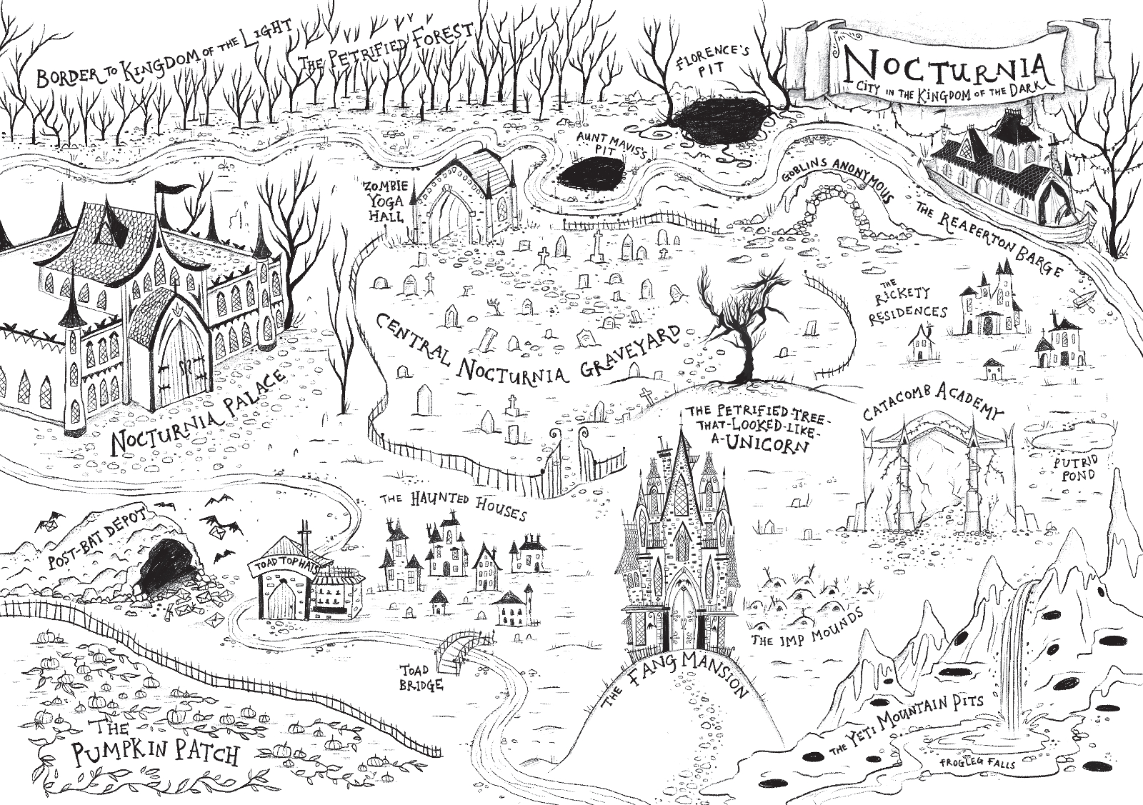 Amelia and her friends loved reading stories about the Creatures of the Light: the gruesome glittery unicorns (Nocturnians were TERRIFIED of glitter), the evil sparkly fairies and the cute and fluffy angel-kittens of terror. It was the stuff of daymares. Everyone knew that while Nocturnians were sleeping and the sun was out, terrifying creatures from the nearby Kingdom of the Light lurked around the Petrified Forest. Nocturnians didn’t dare step outside again until nightfall, if they could help it.