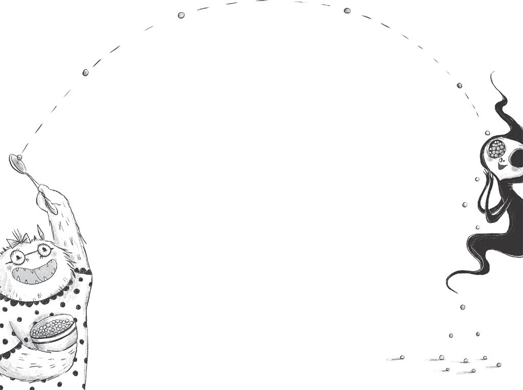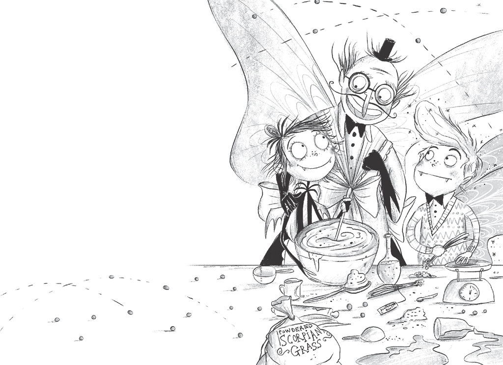 ‘OH, HI MR SLIME!’ Florence bellowed. Grimaldi snorted with laughter so hard that the fifty Perfumed Peas flew out of his nostrils and into Amelia and Tangine’s mixing bowl.