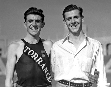 Once his hometown’s resident archvillain, Louie was now a superstar, and Torrance forgave him everything. When he trained, people lined the track fence, calling out, “Come on, Iron Man!” The sports pages of the Los Angeles Times and Examiner were striped with stories on the prodigy, whom the Times called the “Torrance Tempest” and practically everyone else called the “Torrance Tornado.” By one report, stories on Louie were such an important source of revenue to the Torrance Herald that the newspaper insured his legs for $50,000. Torrancers carpooled to his races and crammed the grandstands. Embarrassed by the fuss, Louie asked his parents not to watch him race. Louise came anyway, sneaking to the track to peer through the fence, but the races made her so nervous that she had to hide her eyes.