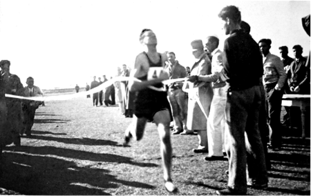 Louie wins the 1933 UCLA Cross Country two-mile race by more than a quarter of a mile. Pete is running up from behind to greet him. Courtesy of Louis Zamperini