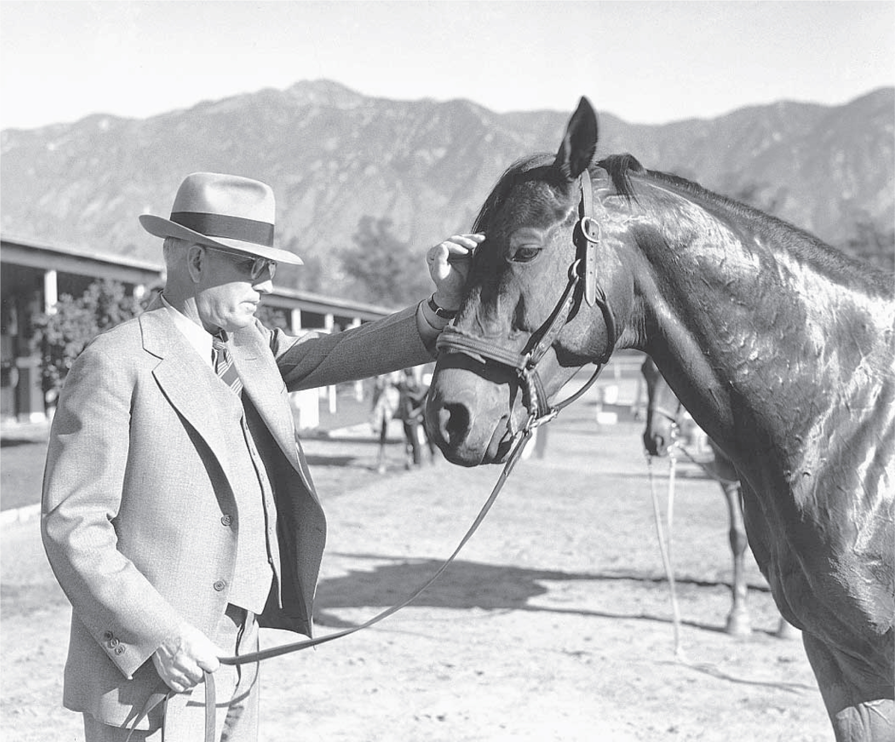 Prosperity, in the form of a fat salary from Howard, had found Tom Smith. He had invested a little in the outer man. Gone were the overalls, the big plaid work shirts, the muddied boots, the chaps, the cap. He began showing up at the barn in neat gray suits, dark vests, whipcord trousers, wing tips, and on race days a restrained Republican tie. He had even purchased a camel-hair coat. Topping off the ensemble was, of course, the utterly unremarkable gray felt fedora. Head and hat were inseparable. Given that Smith was not a man of particularly noteworthy appearance, it was probably the hat, not his face, that people recognized. A couple of years later, during a stable trip to New York, Smith decided that he had just about worn the hat to death and left the barn in search of a replacement. He stomped back in, brushing past Howard, four hours later. On his head was an exact replica of the old hat. Obviously in sour spirits, he muttered that he had spent the entire morning scouring the town trying to find a hat for $2.50.