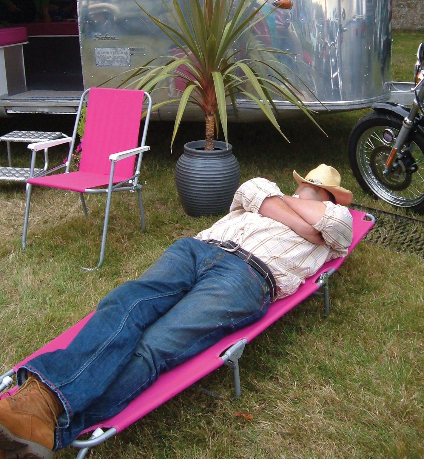 It’s best to decide where your bed is going to be positioned first. I can cope with anything as long as I have a good night’s sleep. But, if deprived of my full eight hours, even in the wilderness, I become impossible. Make sure you think about which way you want to face while sleeping. I like to have my feet facing the door, although at festivals it’s quite popular to sleep with your head close to the door, so you can chat to your neighbours. Make your bed and pile on the pillows.