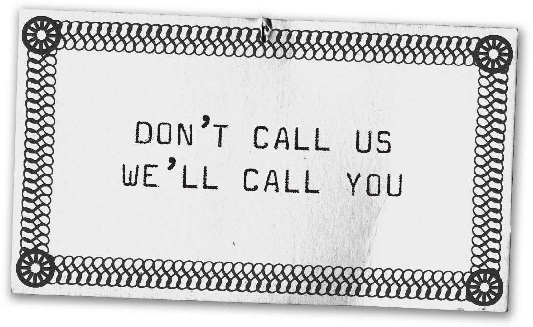 Above the phone were hundreds of cards advertising all kinds of different health giving treatments, from colour therapy to Watsu, and then… a card which simply said, Don’t Call Us We’ll Call You.