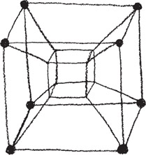 Ruby drew quickly. She had worked out in seconds that the formula represented a tesseract, or a 4-dimensional cube – a shape with 24 edges that was to the cube what the cube was to the square. She chose to render it as a kind of fake 3D image that she knew was called a Schlegel diagram: