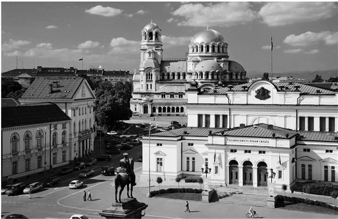 «Значимый цвет может участвовать и в образовании иконической модели изображаемого объекта» [Чертов, 2014, с. 191]. Цвет как иконический знак используется в ландшафте, освоенном человеком, чаще всего применительно к конкретным строениям или особенностям городской архитектуры. Например, православный храм в русской ментальности подразумевает белый цвет стен и золотой купол (хотя есть множество храмов, окрашенных в разные хроматические цвета), т. е. если некий абстрактный храм будет изображаться на открытке, в мультфильме, на плакате, то будут использованы именно эти цвета. Или, например, базовый цвет города, который становится индексом этого города. Типичный пример – желтые мостовые Софии, столицы Болгарии (рис. 2). В самой Болгарии устойчивое словосочетание «на желтых мостовых» означает столичность. Интересно, что устойчивость индексального знака может надолго переживать реальность. Москва в российской ментальности, основанной на фольклоре, – белокаменная, хотя белокаменный Кремль, построенный в XIV в. из доломита и известняка, уже много веков назад был заменен на краснокирпичный.