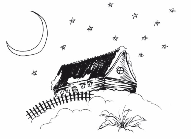 1. По периметру зала развешаны нарисованные на картоне деревенские домики. За ними проведена нить елочных огней (гирлянда).