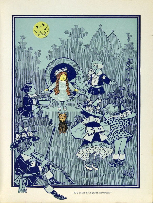 К вечеру, когда Дороти устала после долгой прогулки и начинала уже подумывать, где бы провести ночь, она набрела на дом, выглядевший больше остальных. На зелёной лужайке перед ним танцевали многочисленные мужчины и женщины. Пять маленьких скрипачей наяривали максимально громко, а люди смеялись и пели, тогда как большой стол неподалёку ломился от вкусных фруктов, орехов, пирогов, тортов и прочих съедобностей.