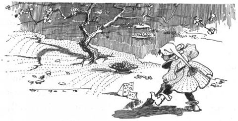 Поначалу он шел по тропе из замечательной гладкой ириски, идти по которой было одно удовольствие, но чем ближе к горам он подходил, тем бугристее становилась тропа, усеянная камнями из круглых леденцов и мармеладок, поэтому туфли короля, которые он сорвал чуточку недозрелыми, стали натирать ему ноги.