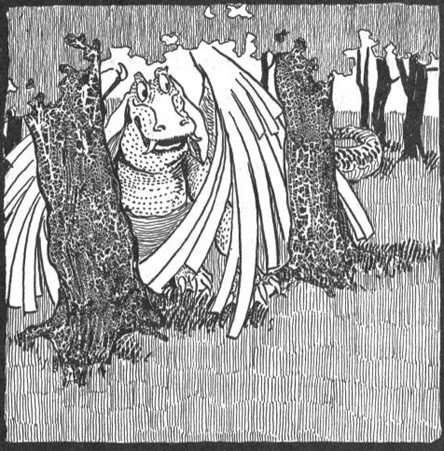 Естественно, король понял, что продолжать сражение бессмысленно – он ведь больше не видел, где находился дракон. Поэтому монарх Мо повернулся и побрел назад к своему народу. Но при каждом шаге он налетал на дерево, что вызывало смех у гадкого дракона. К тому же наш несчастный король не знал, в каком направлении ему следовало идти, а это при любых обстоятельствах порождает весьма неприятное чувство.