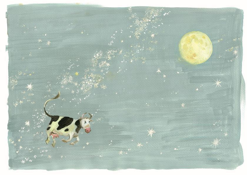 От шума Бобби проснулся. Он открыл глаза в тот момент, когда корова перелетала через отражённую луну, и спросонок ему показалось, что корова перепрыгивает через настоящую луну на небе. Только пёс был в восторге от кошачьей беготни и принялся лаять и носиться вдоль берега. А на берегу после ужина оставалась тарелка, которую пёс нечаянно с громким всплеском сбросил в ручей.