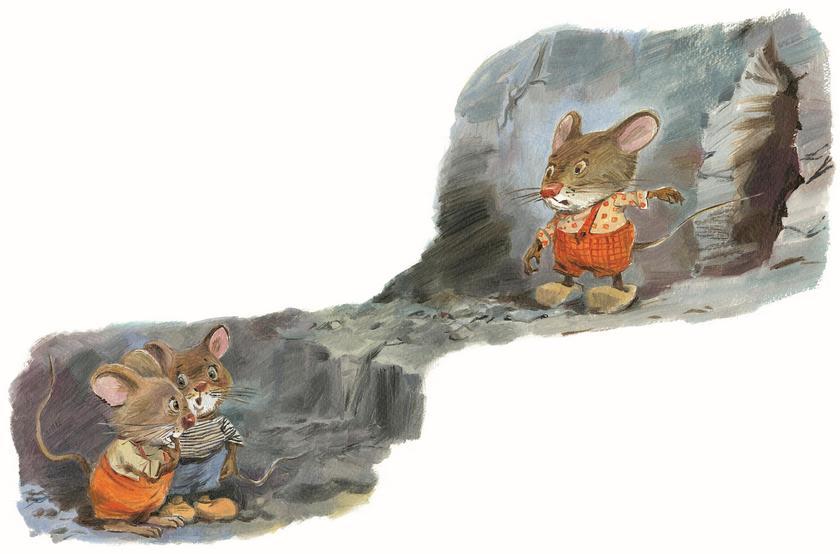 Так три маленьких мышонка отправились в путь. Хикори показывал дорогу, и вскоре они дошли до дыры в стене. Хикори просунул в неё голову и понял, что всё спокойно, ведь семья живших в доме людей крепко спала. Тогда он протиснулся в щель, а за ним последовали два его брата. Их маленькие сердечки бились часто-часто, потому что все знали: если их обнаружат, придётся спасаться бегством. Но в доме было тихо. Мышата набрались храбрости и поползли по толстому ковру, пока не выбрались на лестницу.
