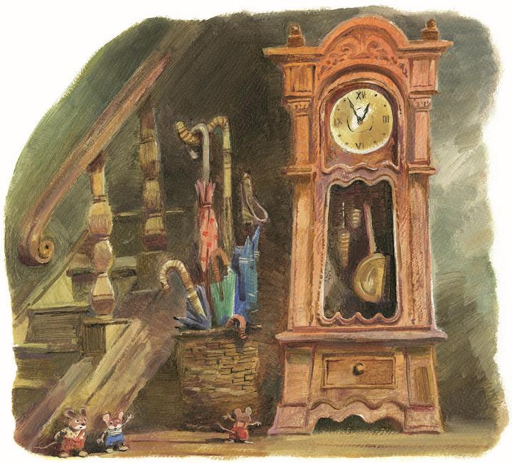 Когда маленькие мышата впервые услышали тиканье часов, они поначалу испугались и прижались друг к дружке, сидя на нижней ступеньке лестницы.