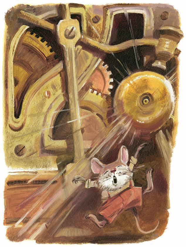 С задней стороны часов ничего такого не было, только отверстие, ведущее внутрь, и Док просунул в него голову. Теперь он слышал тиканье гораздо отчётливее, а, взглянув наверх, увидел высоко над головой что-то блестящее. Он решил, что это, наверное, какая-то особо вкусная еда. Вот бы до неё добраться! Ничего не сказав братьям, Док принялся карабкаться вверх по стенке часов, пока не добрался до часового механизма. Он уже собирался откусить кусочек блестящего колёсика, чтобы узнать, каково оно на вкус, как вдруг раздалось оглушительное «Бум-м-м!».
