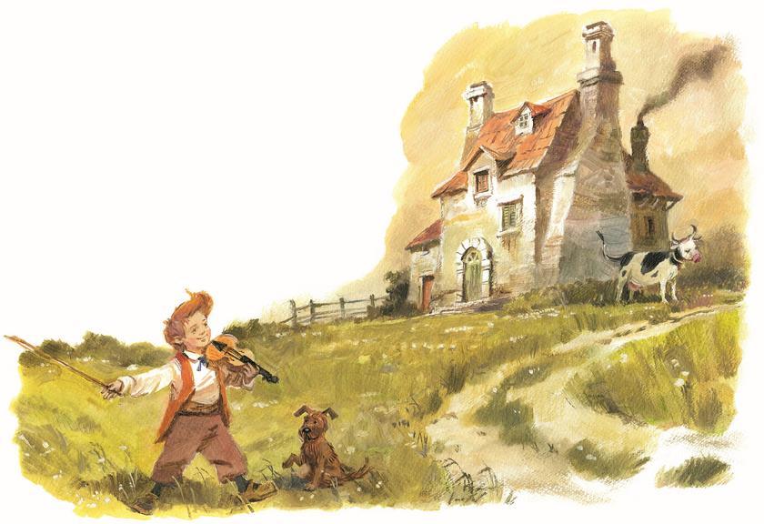 Когда Бобби оправился от неожиданности, он метнулся за кошкой, мчавшейся к дому, и вскоре увидел валявшуюся в траве скрипку, наконец-то отцепившуюся от кошачьего хвоста. Он внимательно осмотрел инструмент и обрадовался, что тот цел, несмотря на такое нешуточное испытание. Потом он отправился за коровой, которую предстояло вести обратно дальней дорогой через мост. А ещё надо было выловить из воды утонувшую тарелку. Но он всё успел, вернулся домой, зажёг лампу и сел сочинять новую мелодию, думая, когда же вернутся из города мама с папой. Кошка оправлялась от испуга и тихо лежала под печкой. Барбос сидел на полу, тяжело дыша и глядя так лукаво, что Бобби подумал, не посмеивается ли пёс над всей этой историей.