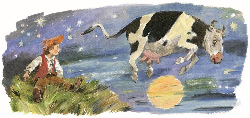 Взгляните: по дорожкеБежит со скрипкой кошка,Корова улетела на Луну!Смеясь, кричит собака:Как высоко, однако!И вдруг тарелка прыгнула в волну.