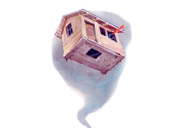 Как раз в том месте, где стоял домик Дороти, столкнулись два ветра – северный и южный, и от этого столкновения и родился свирепый ураган. В самом центре урагана обычно бывает довольно тихо, но оттого, что потоки воздуха всё сильней и сильней давили на стены дома, он поднимался выше и выше, пока не оказался на гребне огромной воздушной волны, которая понесла его, словно лёгкое пёрышко.