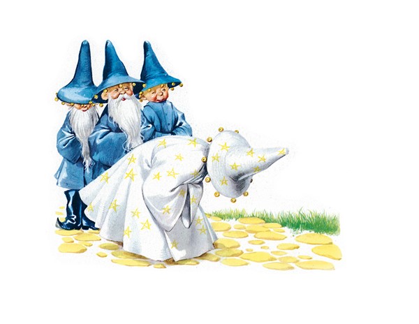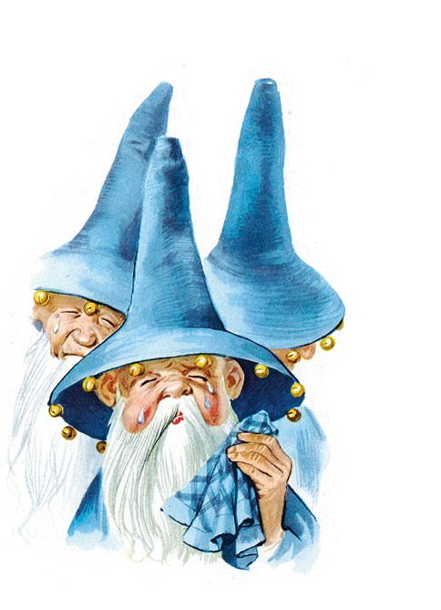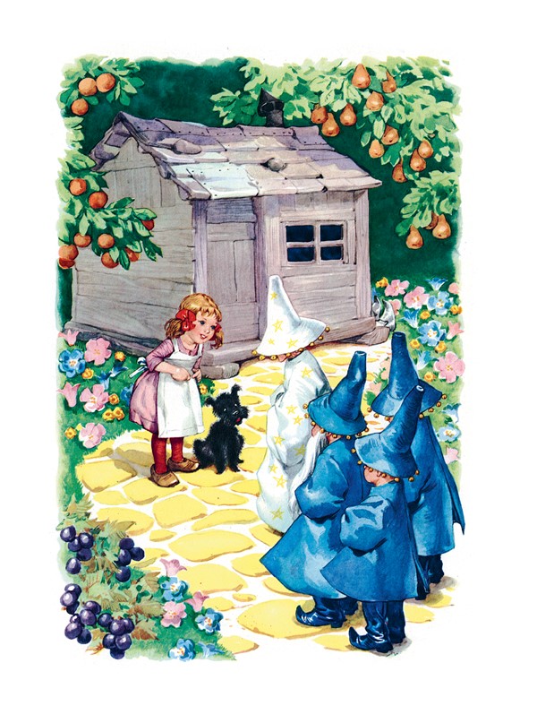 Дороти стояла и любовалась этими чудесами и не заметила, как к ней приблизилась группа очень странных людей. Они были примерно того же роста, что и Дороти, но всё равно было ясно, что это взрослые. Трое мужчин и женщина были одеты в причудливые костюмы. Все они носили высокие остроконечные шляпы с колокольчиками, которые мелодично позвякивали при ходьбе. У мужчин шляпы были голубые, у женщины – белая. Ещё на ней был белый плащ, свободно спадавший с плеч и украшенный звёздочками, сверкавшими на солнце, как маленькие бриллианты. Мужчины были одеты во всё голубое и обуты в сверкающие сапоги с голубыми отворотами. Дороти решила, что они примерно того же возраста, что и дядя Генри. У двоих из них были бороды. А женщина была постарше. Лицо у неё было всё в морщинках, и передвигалась она не без труда.